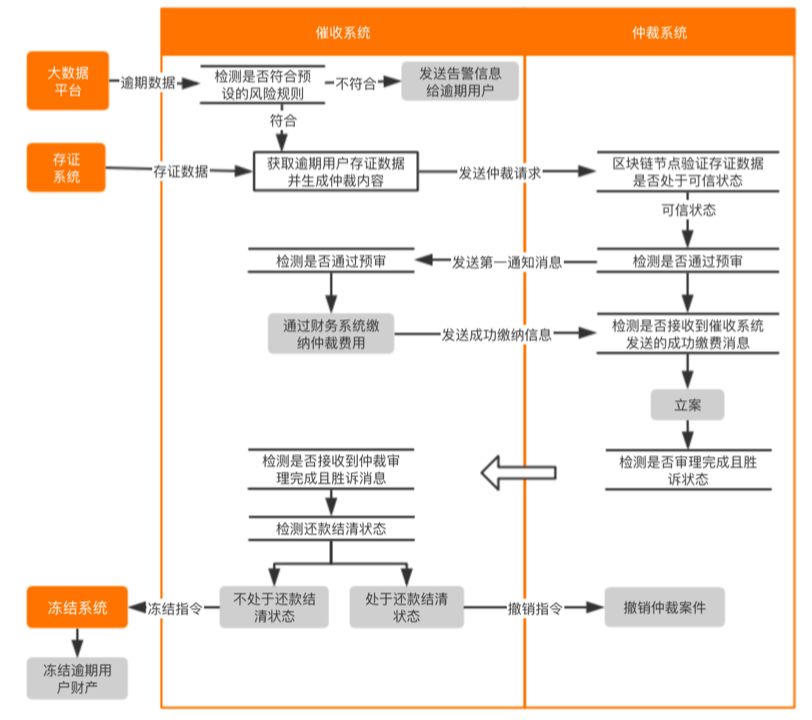 相较SWIFT代理模式的跨境支付,区块链跨境支付系统具有以下优点:汇款行与收款行之间点对点进行交易,省去了代理银行造成的时间成本和资金成本,提高了银行间跨境支付效率;支持7*24时间交易,不受时差与节假日影响;可通过区块链分布式账本实时销账;支持实时查询交易转账状态;可保障数据存储安全,防止数据泄露风险;可通过区块链网络促进数据共享,提高工作效率。 4. 微众银行:基于区块链技术的债务催收 在我国,通过法院仲裁进行债务催收成为银行催收的主要方式之一。然而,目前的仲裁流程主要包括提交仲裁、仲裁庭受理、收集证据、按前调节、出庭举证、组庭裁决等一系列常规步骤,耗时长、效率低。 为此,微众银行研发了一种债务催收系统,基于区块链技术将债务催收自动化、线上化。该系统基于区块链智能合约、共识算法等技术自动触发仲裁流程,减少人工干预,简化催收流程,提高催收效率。 当系统发现用户贷款逾期之后,可以根据规则自动判断是否仲裁;根据逾期数据和区块链节点存证数据自动生成仲裁内容并发送至仲裁系统;自动缴纳仲裁费用;获得仲裁胜诉消息之后,触发并执行债务催收请求,实现仲裁案件的自动化。 图 10:微众银行区块链技术之仲裁催收流程图
