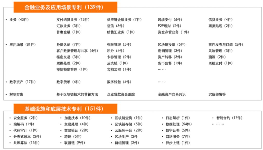 按照专利申请数量可分为3个梯队:专利申请数量超过100件的,仅微众银行一家;专利申请数量在10~100件之间的,有4家,分别是工商银行、中国银行、招商银行和福建省农村信用社联合社;专利申请数量在10件以下的,有10家。 二、银行区块链专利图谱 专利申请人为了能够让专利审核员了解所申请的专利是否具备创新性、实用性、独特性,往往会将将专利技术背景、业务痛点、技术痛点、解决方法及具体流程写入专利申请书中。为此,本报告对区块链技术、应用场景进行整理和统计。 1. 有139件区块链专利与金融业务和应用场景有关 据零壹智库不完全统计,银行申请的区块链专利当中,有151件专利与基础设施和底层技术有关,139件专利与金融业务和应用场景有关。 图 3:银行区块链专利分布情况