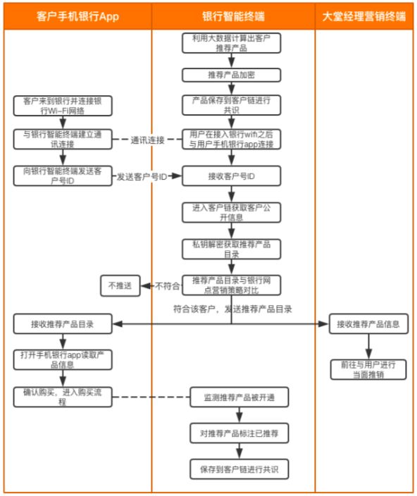 首先,该系统打通了与各政府系统、银行系统之间的数据壁垒,将各系统数据保存在区块链网络中。银行可通过区块链网络直接获取到分散在各个部门之间的客户数据,促进了金融机构与政府部门之间数据共享。并且,基于区块链不可篡改、可溯源等特性,可保障数据的真实性、安全性、及时性和全面性,有效降低银行扶贫贷款业务的难度,提高扶贫贷款用户识别的准确率。 其次,该系统利用智能合约,简化了扶贫贷款审核流程和发放环节,提高了贷款审批速度和资金发放速度,将贷款业务线上化、自动化。福建农信基于智能合约在扶贫贷款管理系统中加入了贷款审批流程合约、贷款管理合约和扶贫贷款贴息申请合约,用户可在申请时,触发智能合约,由系统自动在区块链网络自动收集、整理、分析用户数据。 除此之外,该系统还为政府部门提供了数据获取接口。政府部门可通过区块链网络监控扶贫代理过程的信息流、资金流、审批流。政府部门可通过该系统了解贷款进度,并且对贷款过程中的违规违法行为进行监督管理。 6. 福建农信:基于区块链技术进行产品营销 目前银行的营销方式可以通过大数据分析平台筛选出相关金融产品或服务所对应的潜在客户。但在实际应用中,由于监管要求,银行的营销方式受到很多限制,很大程度上,仍需要客户亲来到银行网点或客户经理上门营销;电话、短信、邮件等营销方式因受到监管要求,效果并不理想。 福建农信基于区块链和物联网技术,发明一种营销方法,在物联网设备之间利用区块链定向客户营销和开放式客户营销,可提高银行营销准确性、有效性、便捷性。 图 12:福建农信区块链专利之智能营销