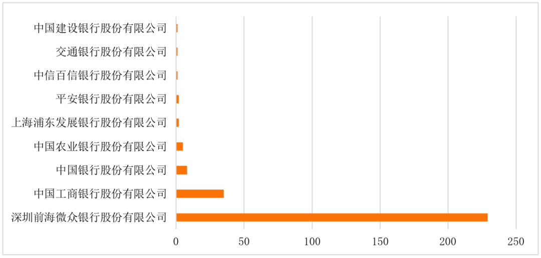 相较2018年,申请区块链专利的银行数量从11家缩减至9家,而区块链专利申请数量则从95件增至284件,成为增长幅度最高的一年。造成区块链专利数量大幅度上升可归结于微众银行,在2019年1~11月,累计申请229件区块链专利。 3. 微众、工行和中行是我国区块链专利申请数量最多的3家银行 截至2019年12月1日,我国共计15家银行申请了区块链相关专利,排在前3的银行分别是微众银行、工商银行和中国银行。 表 1:2019年11月银行区块链专利申请排行